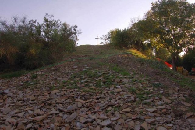 The easternmost side is the oldest of the triangular shaped, terraced mound. Paths were constructed by using smaller shard pieces throughout the four stepped terrace levels to enable the continuation of amphorae disposal and the height of the hill.