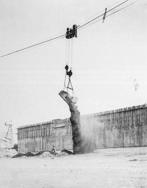 The first concrete block is placed on the downstream face of the Olive Bridge dam. Oct. 18, 1908Â Author New York Public Library