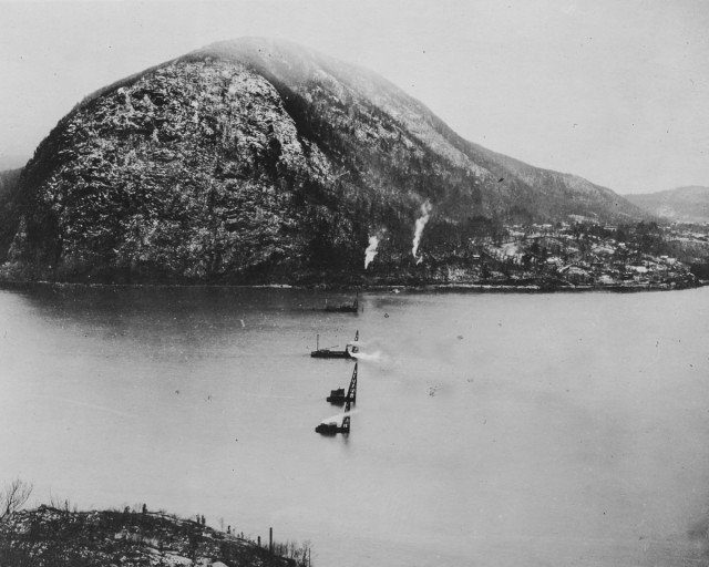 Drills bore into the bed of the Hudson River at Storm King Mountain, where the Catskill Aqueduct crosses from the west side of the river to the east, 1,100 feet underground. Author New York Public Library