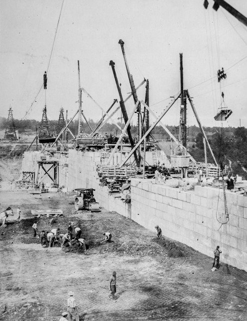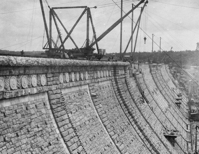 A decorative granite facade is applied to the downstream face of the Kensico Dam. Aug. 12, 1915. Author New York Public Library