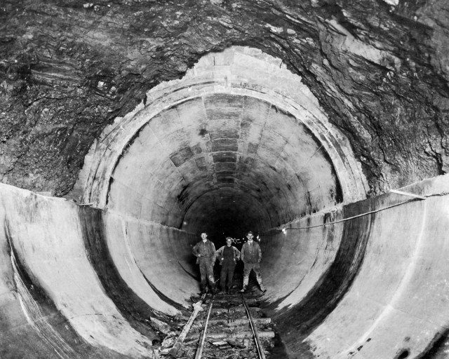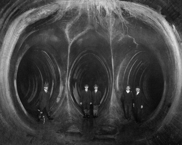 A section of the Rondout pressure tunnel with finished concrete lining in place. Author New York Public Library