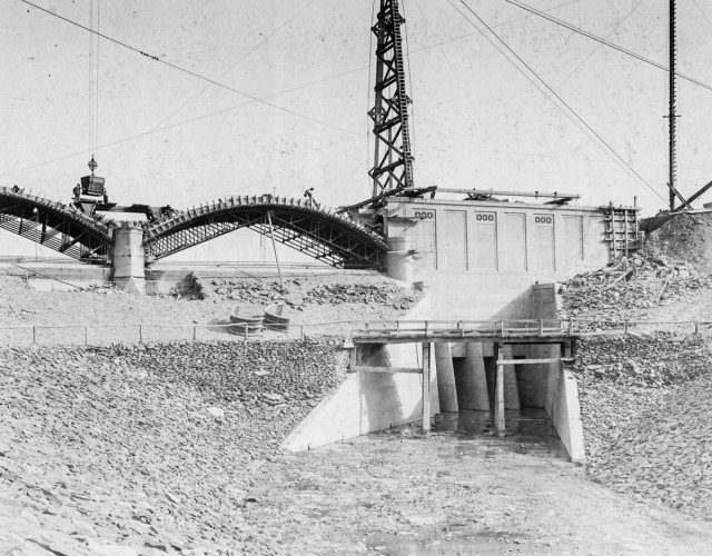 The inlet and gatehouse between two basins of the Ashokan Reservoir, with two arches of the Ashokan Bridge in progress. Oct. 26, 1914Â Author New York Public Library