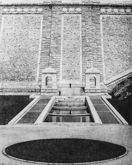 The east pylon of the Kensico Reservoir, with its fountain and cascade basin. Sept. 20, 1917Â Author New York Public Library