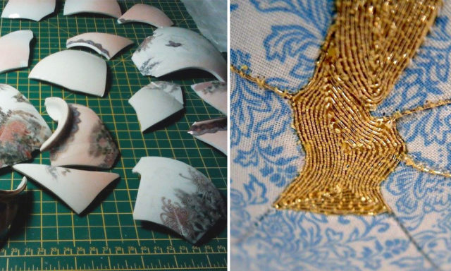 In her artistic interpretation, Bailey uses a golden embroidery to keep together the pieces of the broken vase, a kind of a hybrid between Japanese traditional technique and popular sewing technique which worked  beautifully. To achieve the final product, the artist first wraps each broken piece in fabric  and then utilize gold metallic thread to put the pieces together.