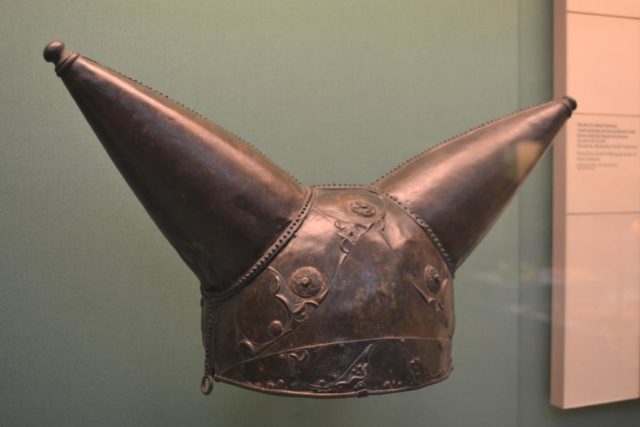 The helmet, found near Waterloo Bridge, was made from two pieces of bronze riveted together to form the cap of the helmet. Two tapering horns tipped with terminal knobs are attached to each side of the top, and more rivets decorate the circumference as well as the spot where the horns join the cap.