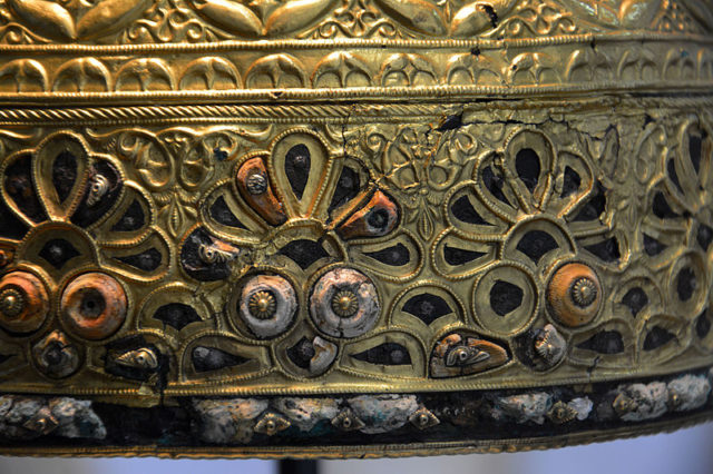All the relief decorations were formed on the bronze strips before the gold leaf was applied. The gold leaf, about 70 microns thick, was affixed by pressing it closely onto the bronze relief with a tool that may have been made of wood or bone. The gold leaf would have been held in place by the grooves and imitationfiligree in the bronze.The coral cabochons were attached to the bronze by silver rivets whose heads are decorated with motifs such as diamonds or palm leaves.Sometimes the hollow that holds the coral was at least partially gold-covered before the coral was placed. Gold leaf was then applied generously around the coral to form a small cup.