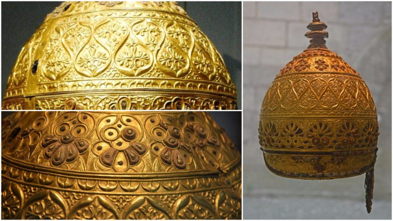 The helmet has been described as having a jockey-cap shape, but the “bill” of the cap is actually a neck-guard.It is 21.4 centimetres (8.4 in) high and 23 by 19 centimetres (9.1 by 7.5 in) laterally.The inner cap of the helmet is of iron, now heavily corroded. It is made of a single piece of hammered iron, with the neck guard riveted to the back. The iron is entirely covered by ornamental bronze bands with low-relief decoration formed partly by casting and partly by repoussé and chasing.The four wide horizontal strips of bronze are fully covered with gold leaf on the outside surface. The decorations include embedded cabochons of shaped and polished coral.