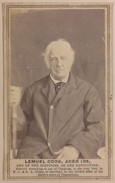 Lemuel Cook was born in Northbury, Litchfield county, Connecticut, on September 10, 1759. He enlisted at Cheshire when only 16 years old. He was the oldest survivor of the Revolution at 105 years old, entering the service of his country in 1781. He served in the Battle of Brandywine and later Yorktown when British General Cornwallis surrendered to the Continental Army, ending the War and guaranteeing American independence.