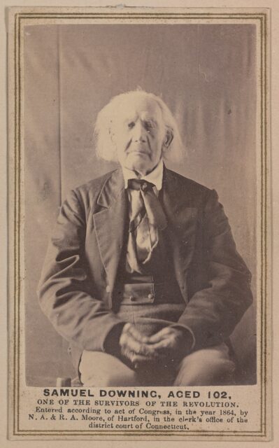 Samuel Downing was born on November 30, 1761, in Newburyport, Massachusetts. At the time his picture was made, he was 102 and living in the town of Edinburgh, Saratoga Country, New York. Downing enlisted in July of 1780 in Hailstown, New Hampshire at the age 16 and served in the Battle of Saratoga in which British General Burgoyne was defeated. He died February 19, 1867, at the age of 106.