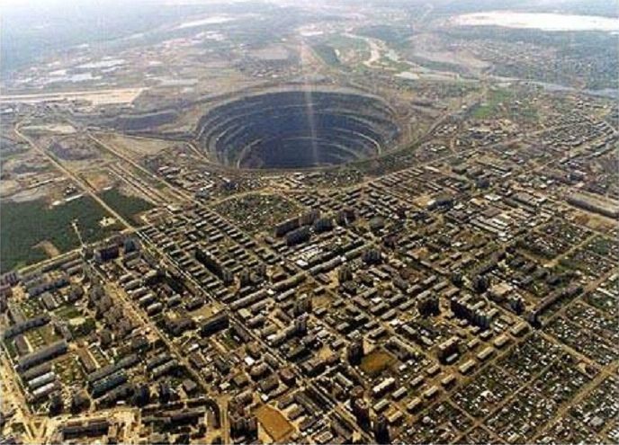 The Mir mine also called the Mirny mine, is a former open pit diamond mine, now inactive, located in Mirny, Eastern Siberia, Russia. The mine is 525 meters (1,722 ft) deep (4th in the world) and has a diameter of 1,200 m (3,900 ft), and is the second largest excavated hole in the world, after Bingham Canyon Mine.