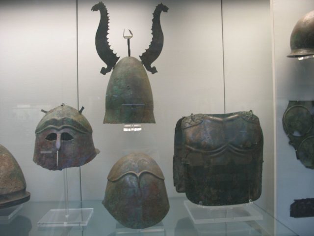 Two bronze statuettes dated to the early 12th century BC, the so-called “horned god” and “ingot god”, depicting deities wearing horned helmets, found in Enkomi, Cyprus. In Sardinia dozens of warriors with horned helmets are depicted in bronze figures and in the monte prama gigantic statues, similar to those of the Shardana warriors (and possibly belonging to the same people) depicted by the Egyptians.