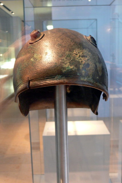 The Waterloo Helmet, a Celtic bronze ceremonial helmet with repoussé decoration in the La Tène style, dating to ca. 150–50 BC, was found in the River Thames, at London. Its abstracted ‘horns’, different from those of the earlier finds, are straight and conical.