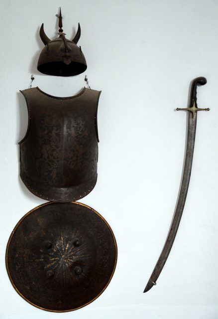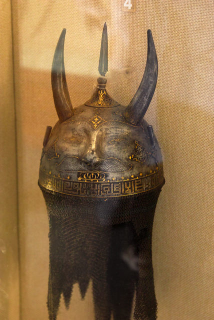 Indo-Persian warriors often wore horned or spiked helmets in battle to intimidate their enemies. These conical “devil masks” were made from plated mail, and usually had eyes engraved on them.