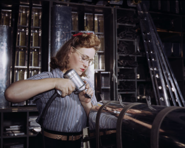 A Douglas Aircraft Company worker rivets an A-20 bomber at the plant in Long Beach, California.