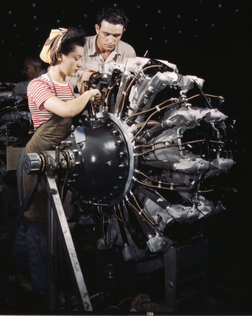 Douglas Aircraft Company employees work an airplane motor at the plant in Long Beach, California.
