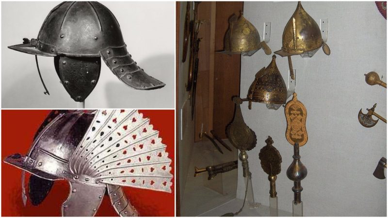 Many helmets were blackened or browned as a treatment to weatherproof them and protect against rust. The better quality helmets given this treatment would often have had their somber appearance relieved by the use of numerous gilded rivet heads. Some of the most flamboyantly decorated helmets were produced for the Polish winged hussars, with metal crests and enlarged, decoratively shaped, nasals being not uncommon.