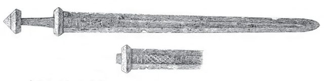 The inscription is in an iron inlay along the center of the blade, close to the hilt, and is almost undecipherable. According to Stephens, the blade was once treated with acid, irreparably damaging the inscription. The closest English translation reads “Thor Owns Me,” referring to the Norse pagan god Thor. The swastika traditionally represented Thor’s hammer. In 1876, the International Congress of Anthropology and Prehistoric Archaeology at Budapest conducted a discussion regarding the symbol’s meaning; most agreed the swastika represented a blessing or good luck.