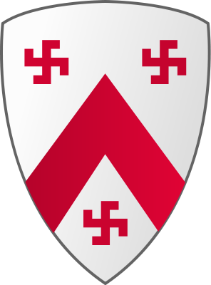 Arms of Leonard Chamberlayne: Argent, a chevron between three fylfots gules — drawn from the blazon given in MS. Harleian, 1394. Photo Credit