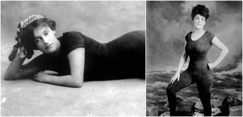 At one of her trips to England for a swimming and diving exhibition at London’s Bath Club, she realized that her usual thigh-bearing suit would be slandered by the British audience, so she acquiesced to the already established conventions and sewed a pair of stockings to a men’s suit. And voila! The Annette Kellerman style swimsuit was created as the very first one-piece swimming suit for women.
