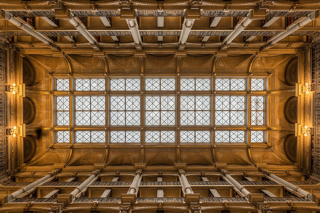 The library interior is one of the most remarkable in the world. The visually stunning, monumental neo-Greco interior features an atrium that, over an alternating black and white slab marble floor, soars 61 feet high to a latticed skylight of frosted heavy glass surrounded by five tiers of ornamental black cast-iron balconies and gold-scalloped columns containing closely packed book stacks.