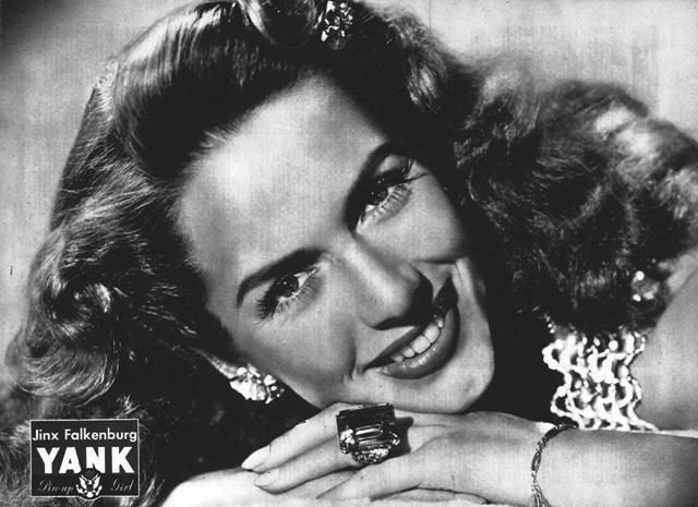 A year earlier she was in Hawaii posing for renowned photographer Edward Steichen for a series of ads for the Hawaiian Steamship Company’s Matson Line, when she fell through a balcony at theRoyal Hawaiian Hotel and landed 30 feet below on a dining room table. While in the hospital recovering from her injuries, she was introduced to singer Al Jolson who was also convalescing there. Jolson wound up offering her a role in his upcoming Broadway show Hold On to Your Hats, that opened in January 1940. Though her part as a cowgirl was small, she stole the show. Fans started gathering nightly at her dressing room door at the Shubert Theater, forming the core of what would become a nationwide “Jinx Falkenburg Fan Club,” the only national fan club not devoted to a movie star.