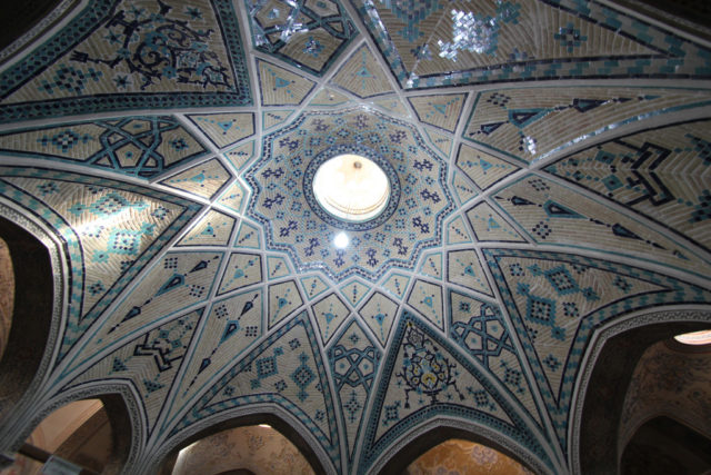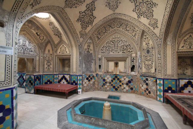 The bathhouse was damaged in 1778 as a result of an earthquake. During the Qajar era (1785 to 1925) it was renovated and it underwent further renovations in 1996. Characterized by vaulted ceilings, exquisite mosaics, and beautiful paintings, this gorgeous structure, with an area of around 1000 square meters, consists of two main parts: Sarbineh (the dressing hall) and Garmkhaneh (the main washing area with hot and cold pools and sitting areas). Sarbineh is a large octagonal hall, which has an octagonal pool in the middle separated by eight pillars from the outer section.
