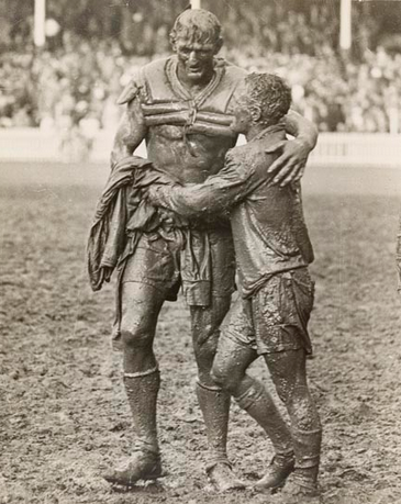 The 1963 NSW Rugby League Premiership Grand Final between long term rivals Western Suburbs and St George was played in a torrential downpour on Saturday, 24 August. This, combined with the fact that the centre cricket pitch area of Sydney Cricket Ground was notoriously muddy in such conditions, ensured that the players were not only saturated but also caked in mud from head to toe. At the conclusion of the hard fought match which was won by St George, the captains of the two teams, the tall Norm Provan and more diminutive Summons respectively, embraced in appreciation of each other’s stoic efforts. The moment was captured by a newspaper photographer, John O’Gready, and published in the following day’s Sun Herald. Subsequently the image won several awards, becoming known as The Gladiators. Summons has recently said that The Gladiators actually shows him complaining about the referees decision to Norm Provan.