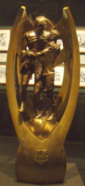 The Provan-Summons Trophy is the NRL’s main prize, awarded to the team that wins the premiership. Its sculptured design is similar to the Winfield Cup trophy, which was introduced for the 1982 NSWRFL season. It is a three-dimensional cast of a famous photo called The Gladiators, which depicts a mud-soaked Norm Provan of St. George and Arthur Summons of Western Suburbs embracing after the 1963 NSWRFL season’s Grand Final. It was not officially named the Provan-Summons Trophy until 2013, the 50th anniversary of the 1963 Grand Final.The trophy is awarded following each grand final to the captain of the winning club.Each player from the premiership winning side are also awarded Premiership Rings.