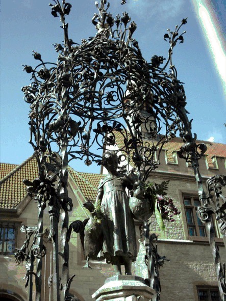 The Gänseliesel (The Goose Girl) is a fountain which is the most celebrated icon of the medieval city of Göttingen in Lower Saxony, Germany. The statue of the Goose Girl was erected after the old fountain, which was falling apart, was pulled down so the town held a contest to pick a replacement.