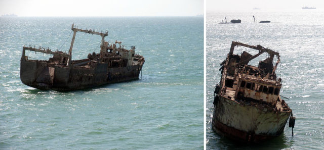 Because of the economic degradation coupled with a lack of jobs and income for the population, the government allows a large number of companies using the waters around the peninsula as the last stop for ships. Ships were brought from all over the world to be left in the shallow waters with a particular boom during the 1980’s. After nearly three decades of this practice, Nouadhibou’s coastline is a unique landscape of over 300 rotting ships and has become known for being one of the largest cemeteries of abandoned ships in the world.