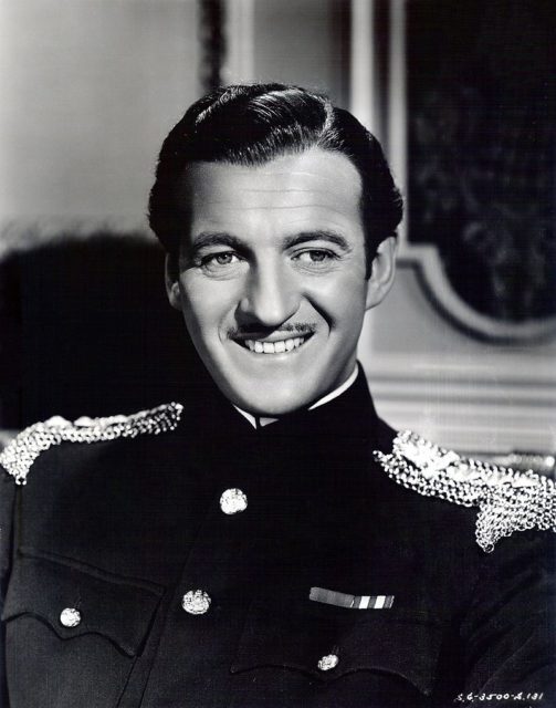 After Britain declared war on Germany in 1939, Niven returned home and rejoined the British Army. He was alone among British stars in Hollywood in doing so; the British Embassy advised most actors to stay. Niven was recommissioned as a lieutenant into the Rifle Brigade (Prince Consort’s Own) on 25 February 1940, and was assigned to a motor training battalion. He wanted something more exciting, however, and transferred into the Commandos. He was assigned to a training base at Inverailort House in the Western Highlands. Niven later claimed credit for bringing future Major General Sir Robert E. Laycock to the Commandos. Niven commanded “A” Squadron GHQ Liaison Regiment, better known as “Phantom”. He worked with the Army Film Unit. He acted in two films made during the war, The First of the Few (1942) and The Way Ahead (1944). Both were made with a view to winning support for the British war effort, especially in the United States. Niven’s Film Unit work included a small part in the deception operation that used minor actor M.E. Clifton James to impersonate General Sir Bernard Montgomery. During his work with the Film Unit, Peter Ustinov, though one of the script-writers, had to pose as Niven’s batman (essentially his servant). Niven explained in his autobiography that there was no military way that he, as a lieutenant-colonel, and Ustinov, who was only a private, could associate, other than as an officer and his subordinate, hence their strange “act”. Ustinov later appeared with Niven in Death on the Nile (1978).