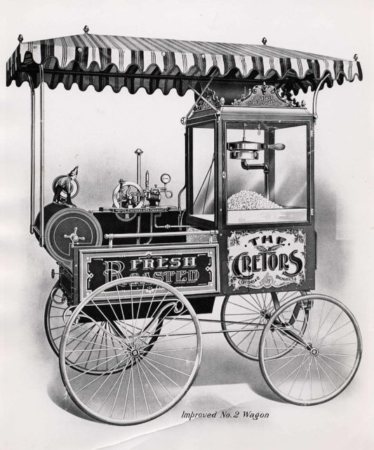 Popcorn’s accessibility increased rapidly in the 1890s with Charles Cretors’ invention of the popcorn maker. Cretors, a Chicago candy store owner, created a number of steam-powered machines for roasting nuts, and applied the technology to the corn kernels. By the turn of the century, Cretors had created and deployed street carts equipped with steam-powered popcorn makers.