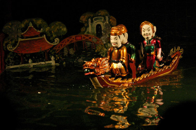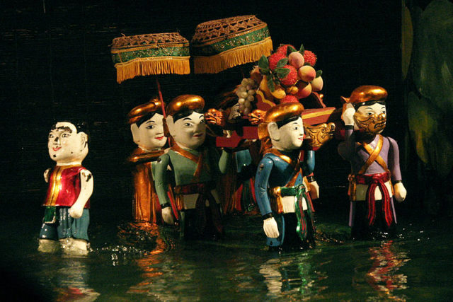 Water puppetry (Vietnamese: Múa rối nước, litterally: “Making puppets dance on water”) is a Vietnamese tradition that dates back as far as the 11th century and is thought to have developed in the villages of the Red River Delta area of northern Vietnam. For centuries, Vietnamese kids and grown-ups alike have been entertained by this unique kind of puppet show.