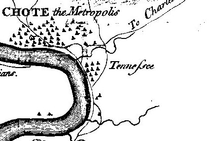 Tanasi was reported by Euro-American traders from their first explorations in the region in the early 18th century, but Chota does not appear in the historical record until around 1745. The maps of John Herbert and George Hunter, drawn in 1727 and 1730, respectively, show Tanasi but not Chota. In 1746, English agent George Pawley met with Cherokee leaders at the Chota townhouse, indicating Chota had usurped Tanasi as the more dominant town. Missionary William Richardson visited the Overhill towns in the late 1750s and described Chota and Tanasi as being separated by a “small river.” Richardson’s description is supported by Timberlake’s 1762 map, which recorded the two towns’ sites.