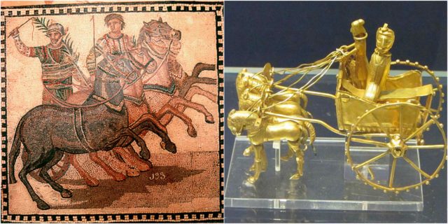 During his campaigns in Britain in 55 and 54 B.C., Julius Caesar became the first Roman general to encounter the war chariots of the native Celtic tribes. These vehicles were usually drawn by two horses, sporting iron-rimmed wheels and sturdy platforms made of wicker and wood.