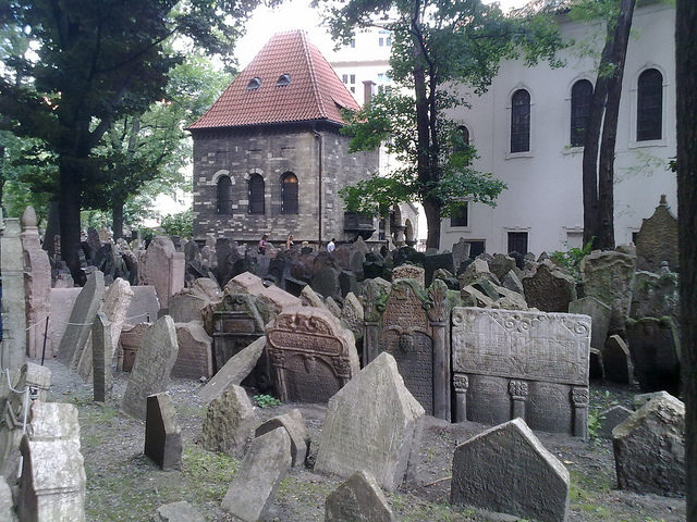 Sometimes visitors enter from the Pinkas Synagogue, which serves as a memorial to the victims of the Holocaust, and leave pebbles or prayers written on small pieces of paper on the tombstones.
