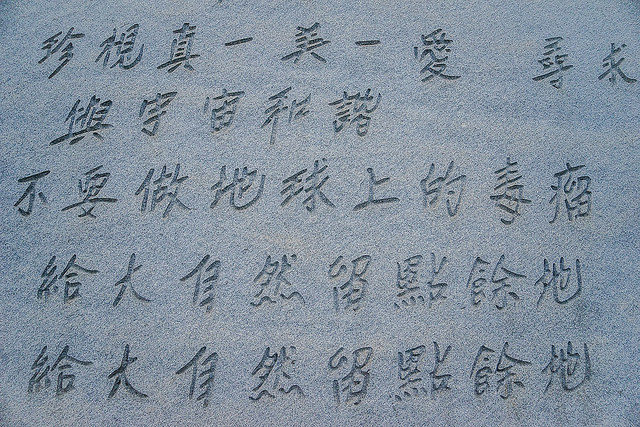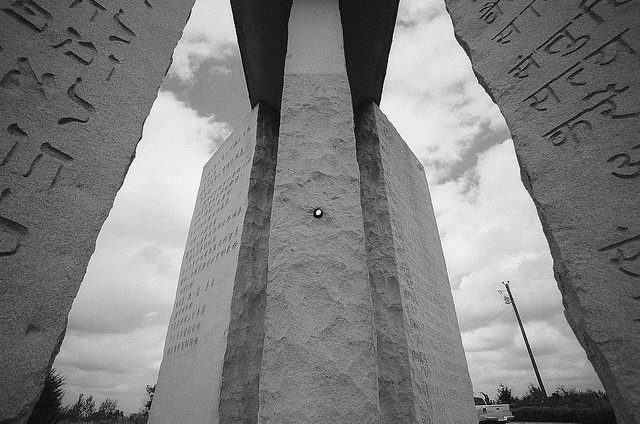 A set of 10 guidelines is inscribed on the structure in eight modern languages, and a shorter message is inscribed at the top of the structure in four language scripts: Babylonian, Classic Greek, Sanskrit, and Egyptian hieroglyphs. The monument is alternately referred to as The Georgia Guidestones or the American Stonehenge. These pale gray rocks are quietly awaiting the end of the world as we know it.