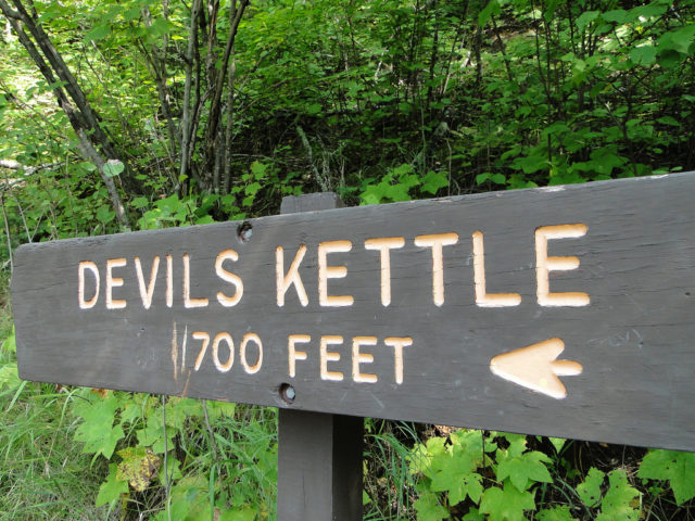 The park is best known for “The Devil’s Kettle”, an unusual waterfall located on the Brule River 1.5 miles (2.4 km) from its mouth. The river splits in two to flow around a mass of rhyolite rock. The eastern flow goes over a two-step, 50-foot (15 m) waterfall and continues downstream.