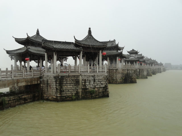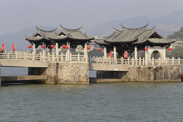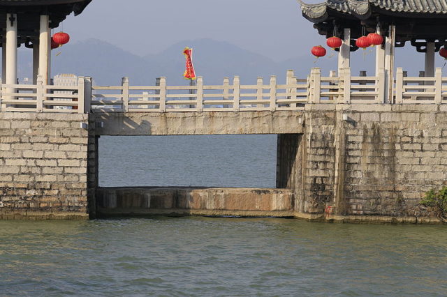 It was first built by the procurator Zeng Jiang in 1170. He named it “Floating Bridge“ because the entire bridge was a floating structure supported by eighty-six huge boats. Stone pillars were sunk to form massive piers stretching out into the river. Once the two piers were built on each side of the river, the middle part was connected by floating boats. In the year 1174, it was flooded and broken so another magistrate of a prefecture Chang Wei led workers to reconstruct it.