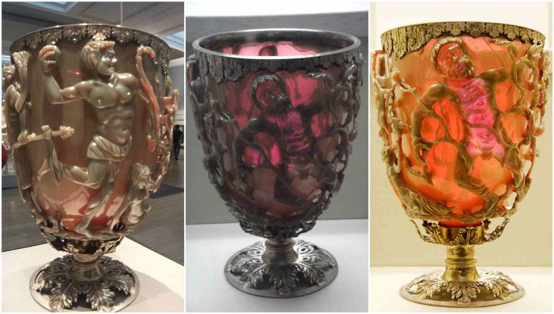 The vessel manufactured from a diachronic glass is a fascinating piece because it changes its colors in certain lighting conditions. The Lycurgus Cup has a red color when it’s lit from behind, and green when it’s lit from the front. Besides making vessels out of it, this type of glass was also used for jewelry and stained glass.