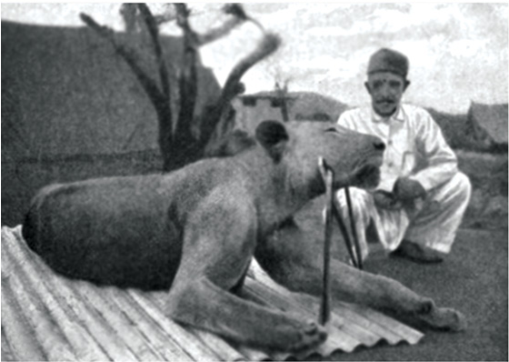 Patterson writes in his account that he wounded the first lion with one bullet from a high caliber rifle. This shot struck the lion in its back leg, but it escaped. Later, it returned at night and began stalking Patterson as he tried to hunt it.