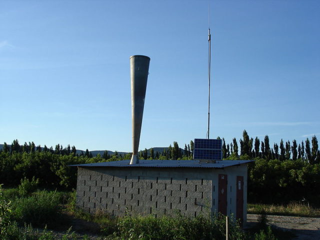 The Hail Cannon is a funnel-shaped device that supposedly disrupts the formation of hailstones by creating shock waves. A mixture of acetylene and oxygen is ignited in the lower chamber of the machine and as the resulting blast passes through the neck and into the cone, it develops into a shock wave. This shock wave then travels at the speed of sound through the cloud formations above, a disturbance which manufacturers claim disrupts the growth phase of hailstones.