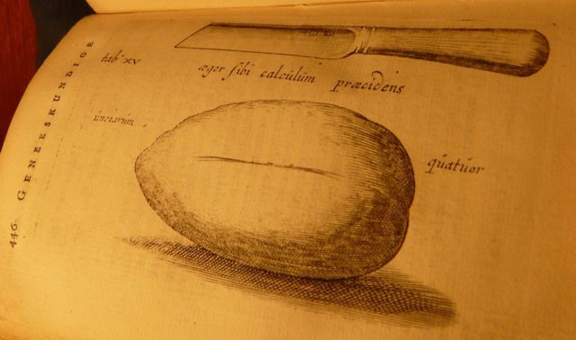“Joannes Lethaeus, a Smith, a courageous man, and very astute, who had already been treated twice by a stonecutter, desired so little to be treated a third time by such a man among his daily trials and repeated slayings, that he decided any wild adventure was more attractive to him than subjecting himself to the knife of the stonecutter ever again. Convincing himself that his health could only improve, and having decided that no one but himself would cut into his flesh, he sent his unknowing wife to the fish market. Only letting his brother help him, he instructed him to pull aside his scrotum while he grabbed the stone in his left hand and cut bravely in the perineum with a knife he had secretly prepared, and by standing again and again managed to make the wound long enough to allow the stone to pass. To get the stone out was more difficult, and he had to stick two fingers into the wound on either side to remove it with leveraged force, and it finally popped out of hiding with an explosive noise and tearing of the bladder.”