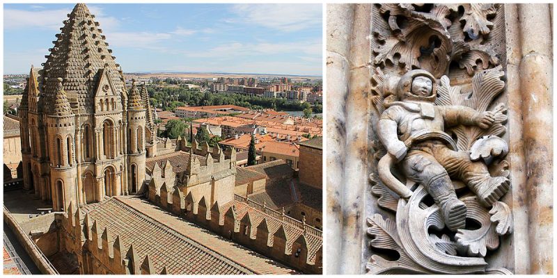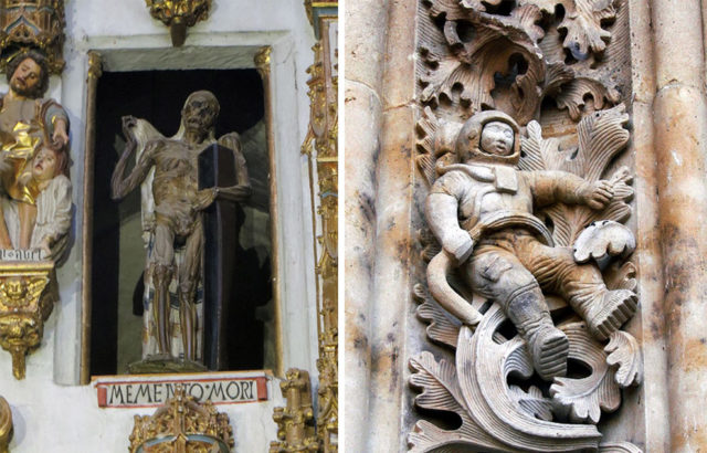 What is interesting about this cathedral is that among the ornate carvings on the façade are those of a faun eating an ice cream, a lynx, a bull, a crayfish, and an astronaut (complete with boots, helmet, and breathing apparatus on his back with tubes attached to the front of his suit). Photographs of this astronaut figure have been circulating online via email, forums and blogs for years now, generating a considerable amount of debate.