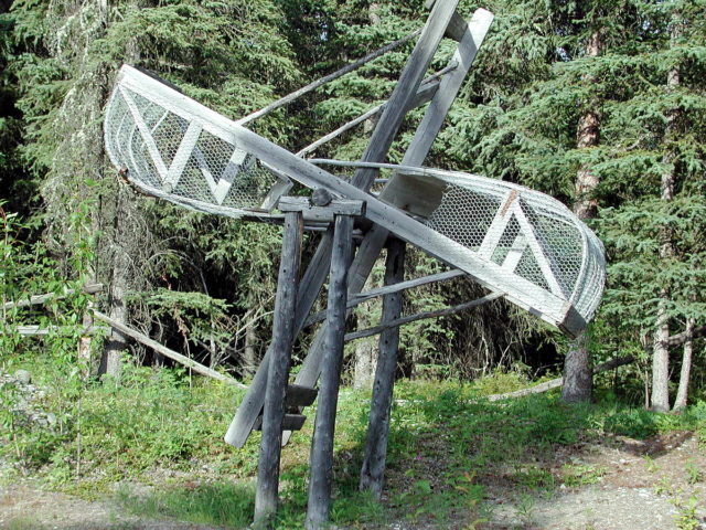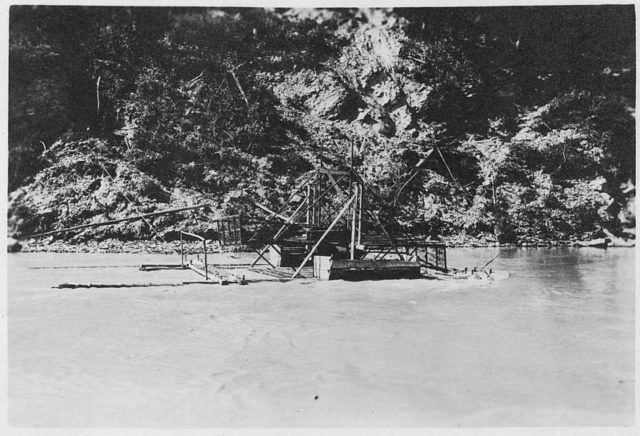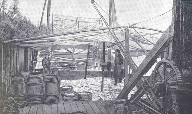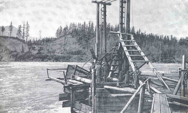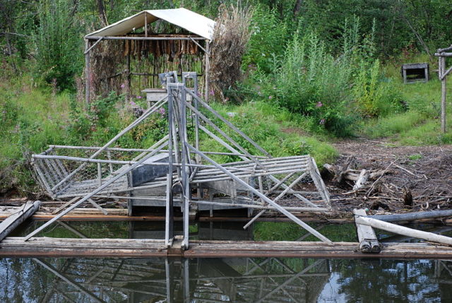 When the wheel is floated on the river, the river current turns the wheel causing the baskets to scoop down upon the salmon traveling upstream and lift them out of the water. The ingenious device can catch large amounts of fish, and the best part is that the fishermen don’t even have to be there. A holding tank is placed beside the wheel to receive the falling fish. A harvester need only come by only a few times each day to remove and process caught fish from the holding tank.