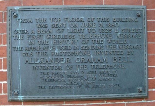 Tainter had stood on the roof of the school building and transmitted to Bell at the window of his laboratory. However, the plaque did not acknowledge Tainter’s scientific and engineering contributions.