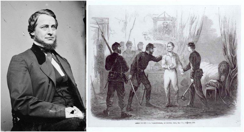 In 1863, he made vigorous speeches in Ohio against the war and the government and consequently grew to be one of the most suspected and hated men in the North. He was arrested in May by military authorities for expressing treasonable sympathy with the enemy; tried and found guilty by a military commission, he was sentenced to imprisonment. Soon afterward, Lincoln commuted his sentence to banishment behind Confederate lines.