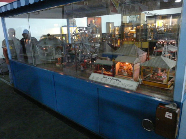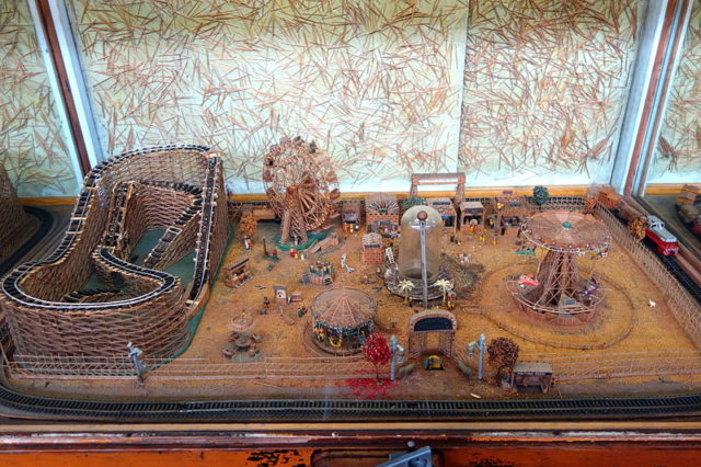 The museum has many rare and historical pieces. A large diorama of a traveling carnival with a Ferris wheel and other rides sits in the center of the museum. The museum owns what is believed to be the only steam-powered motorcycle in the world, built in Sacramento, in 1912. The Royal Court diorama features couples ballroom dancing and was featured in the Panama–Pacific International Exposition. Laffing Sal, which has been described as “famously creepy”, is a 6-foot-tall, laughing automaton and a copy of the original. Some of the most interesting machines are the ones made by prisoners at Alcatraz, including elaborate creations using toothpicks.
