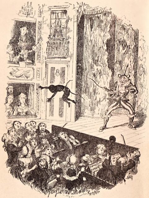 Joe’s debut into the pit at Sadler’s Wells, illustration by George Cruikshank for Dickens’s memoirs of Grimaldi.