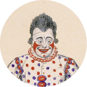 He showed up with oversized clothes, wildly patterned version of the shirt, ruff, and pantaloons he had worn at school, with child’s slippers and a tower of colored wigs. Then came the face, with its red mouth, rouged cheeks, and curving eyebrows.
